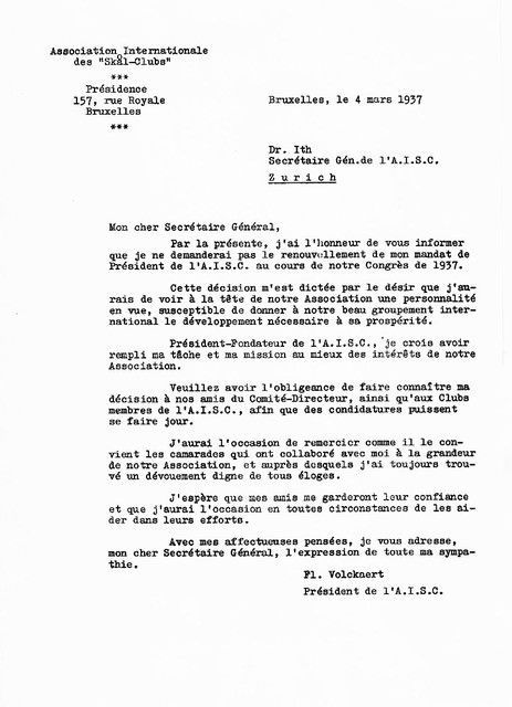 The following day, 04 March, Florimond Volckaert wrote to Dr. Ith, informing him that he will not submit his candidacy at the next congress, to say, "to see a personality at the head of Skål that helps its development and prosperity". He knew his capabilities full well.
