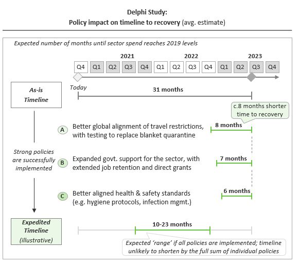 Dada la profunda caída en 2020, la larga duración de la crisis y la segunda oleada de infecciones por COVID-19, los expertos de Delphi consideran que el apoyo continuado de los gobiernos es de vital importancia. Lo ideal sería que el apoyo gubernamental estuviera más orientado al sector de los viajes y el turismo y que abarcara a todos los tipos de actores del ecosistema, con programas específicos dirigidos a las PYMEs y a las grandes empresas.