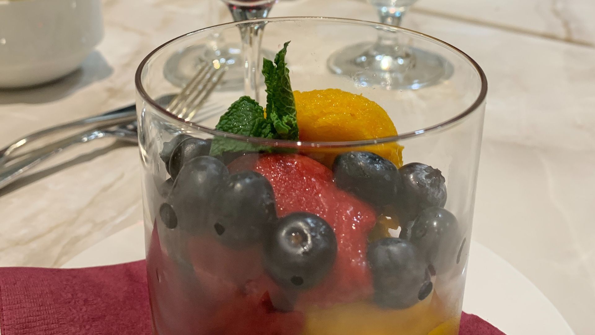 Sorbete de mango y frambuesa, mango Alphonso, frambuesa Killarney, bayas azules frescas.