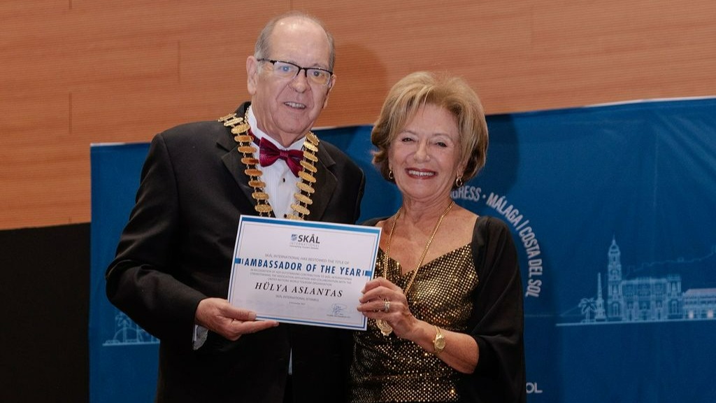 La Pasada Presidenta de Skål International, Hülya Aslantas, que asistió al evento y aceptó el reconocimiento en nombre de Skål International, y el Sr. Ion Vilcu, Director del Departamento de Miembros Afiliados de la Organización Mundial del Turismo, entregaron el reconocimiento al Presidente de Skål International, Juan I. Steta.
