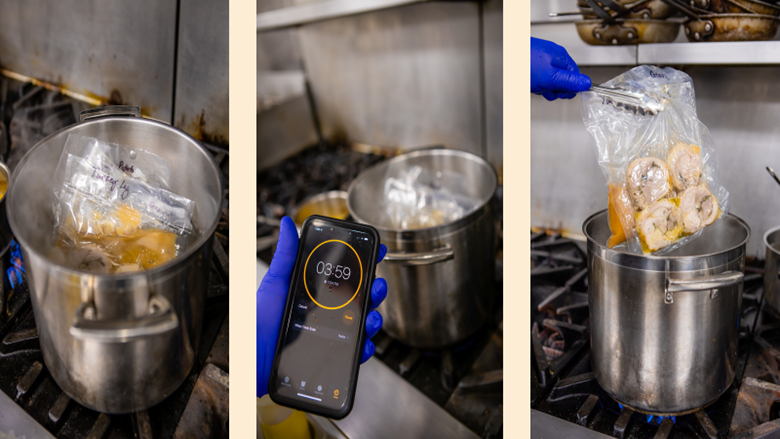 Sous vide is a cooking method that simmers vacuumed packed ingredients for maximum flavour and texture, so the items only needed to be re-heated in simmering water in the sealed bags. Executive Chef from the Malcolm broadcast over Zoom the exact timing for the full preparation.